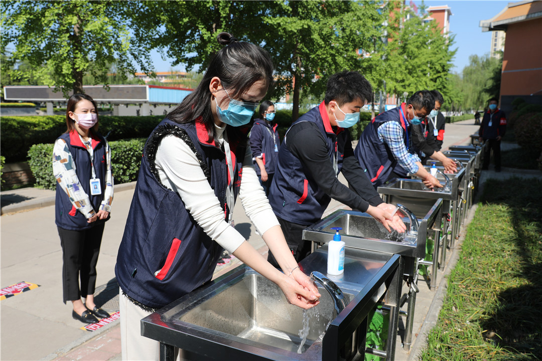 “学生”依次在餐厅前的感应水池处按照七步洗手法洗手后排队进入餐厅