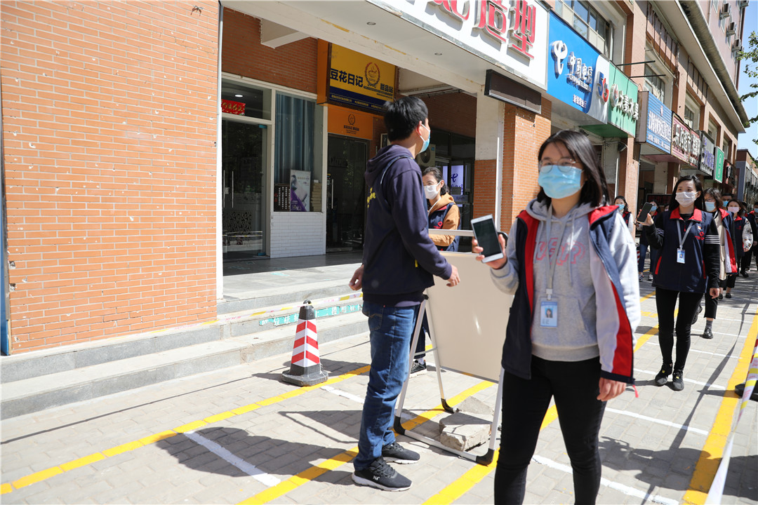 持绿码者“学生”间隔1.5米,有序排队通过等候区