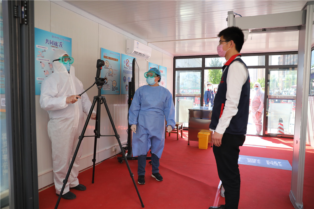 绿码学生消毒后依次在通过式温度探测门迅速测量体温,体温正常者在指定入口刷脸验证身份信息,确保是本校学生后进入校园