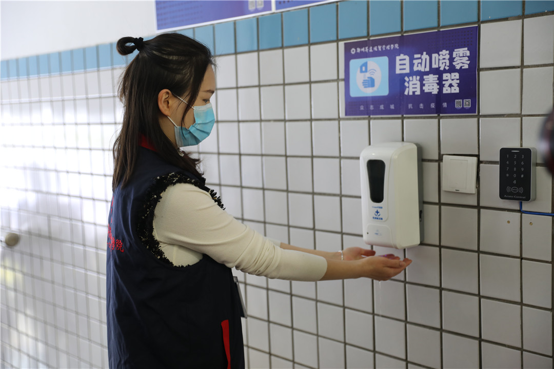 餐厅入口和出口处均安装自动喷雾消毒器,提高消杀的频率和效果