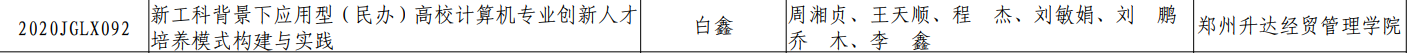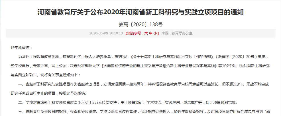 根据《河南省教育厅关于公布2020年河南省新工科研究与实践立项项目的通知》(教高〔2020〕138号),我校信工学院白鑫院长主持的《新工科背景下应用型(民办)高校计算机专业创新人才培养模式构建与实践》项目成功立项。