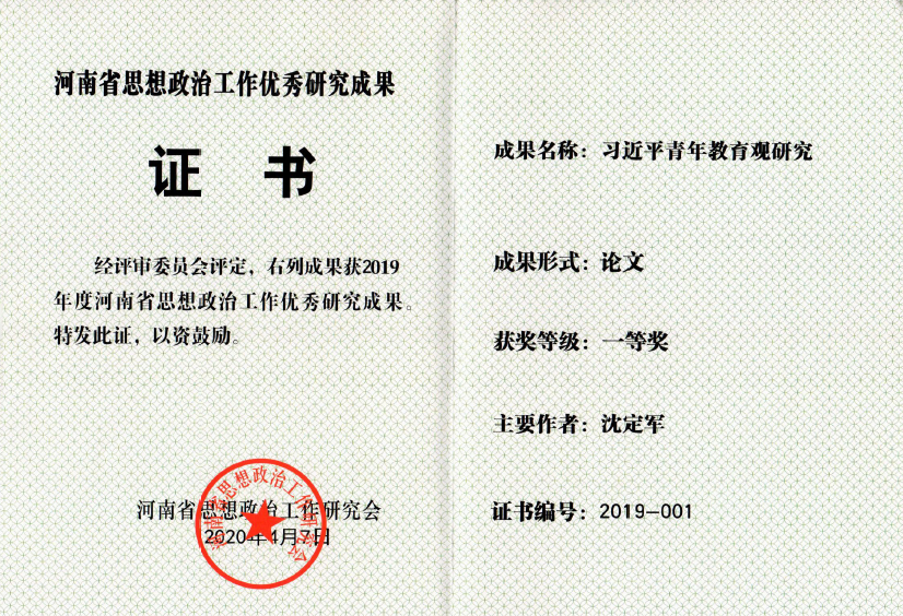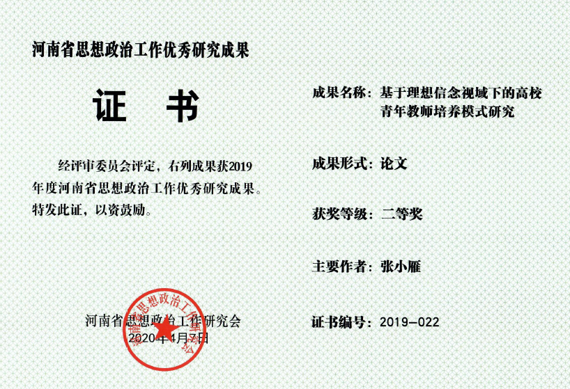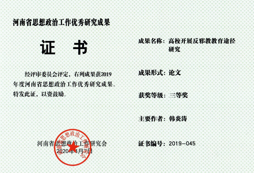 近日,河南省政研会2019年度优秀研究成果评选结果揭晓。我校有3项成果获河南省政研会优秀研究成果奖,分别是:沈定军撰写的论文《习近平青年教育观研究》荣获一类优秀研究成果;张小雁撰写的论文《基于理想信念视域下的高校青年教师培养模式研究》荣获二类优秀研究成果;韩炎涛撰写的论文《高校开展反邪教教育途径研究》荣获三类优秀研究成果。