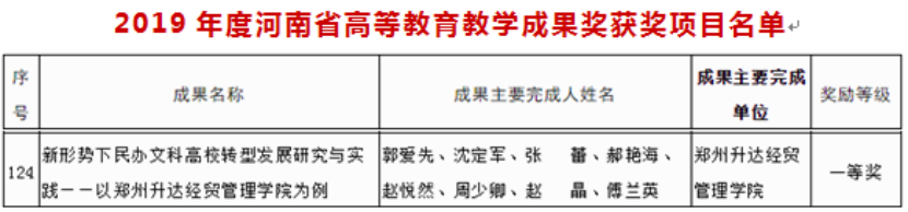日前,河南省教育厅下发了《关于公布2019年度河南省高等教育教学成果奖获奖项目的通知》(教高〔2020〕151号),我校郭爱先校长主持完成的《新形势下民办文科高校转型发展研究与实践——以郑州升达经贸管理学院为例》喜获一等奖,实现了我校省级教学成果奖历史性突破。