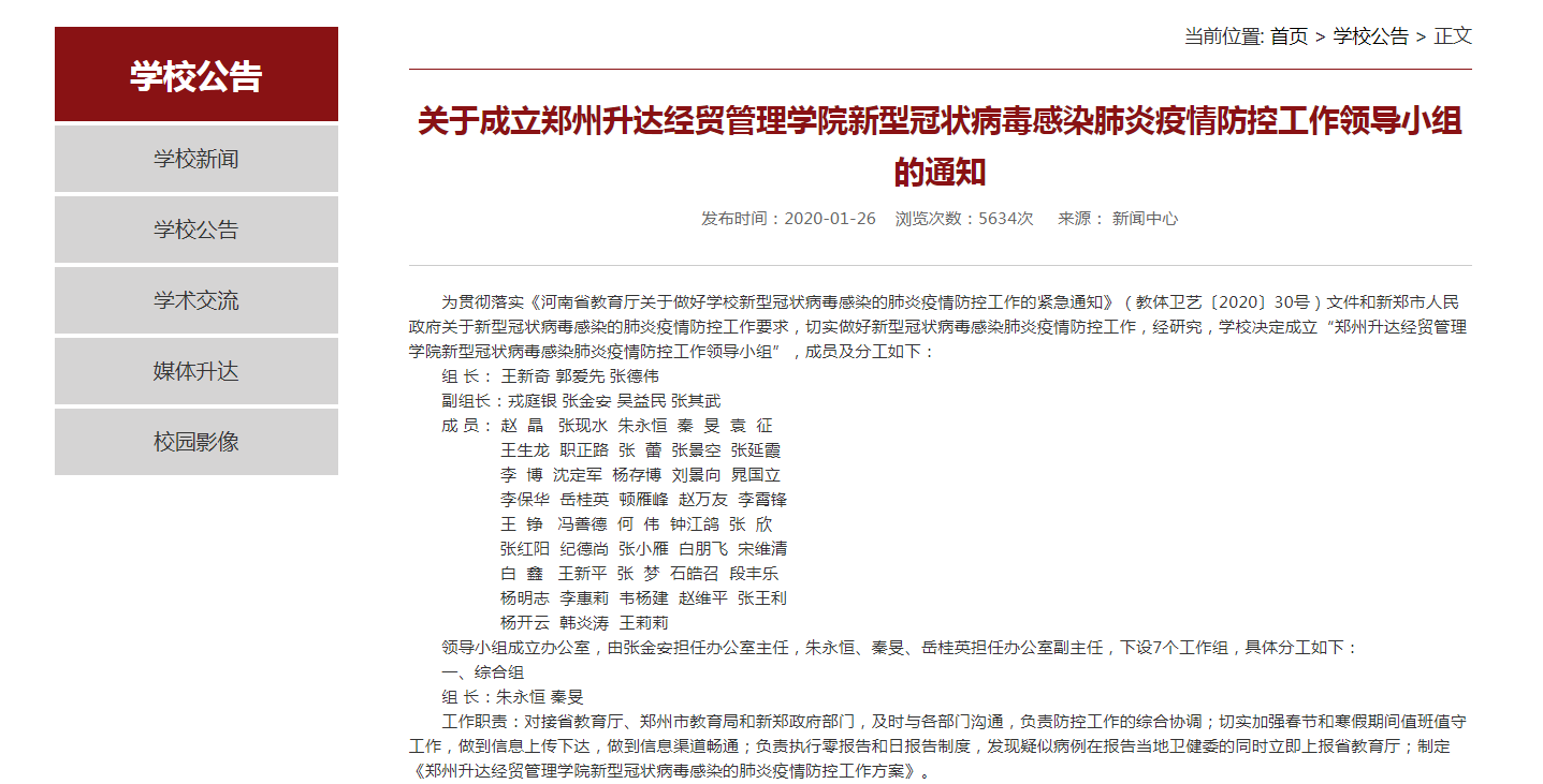 校领导坐镇指挥,坚持深入防控一线,各院部及相关单位检查督导疫情防控及返校复学工作,出台学校《突发公共卫生事件应急预案》《新型冠状病毒感染的肺炎疫情防控工作开学方案》等十余项制度,确保人员组织到位、制度到位、各层级防控责任和各项措施落实到位。