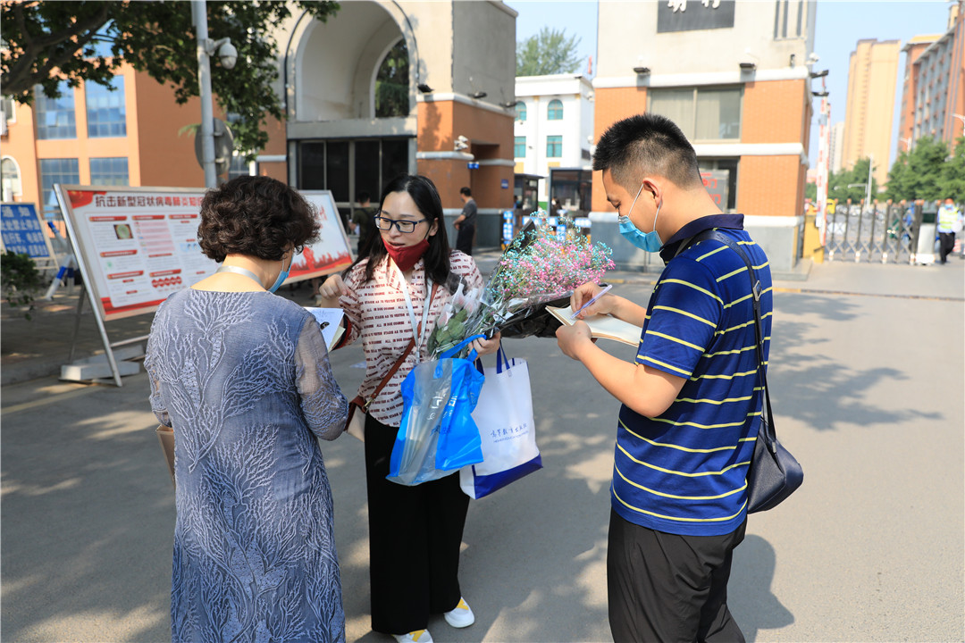 文法学院的田妍妍老师手抱着鲜花,满脸都是幸福的神采,翘首等待同学们回家。她说,“今天我的学生回来了,我好高兴,特意去买了几束花,跟他们合影。”