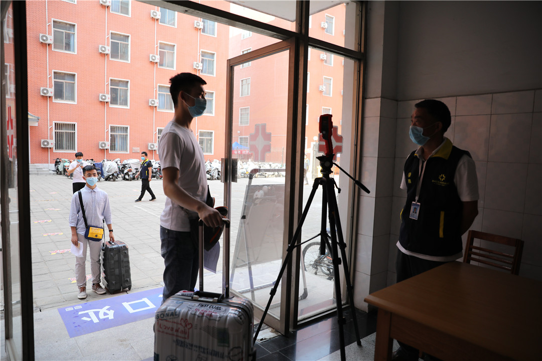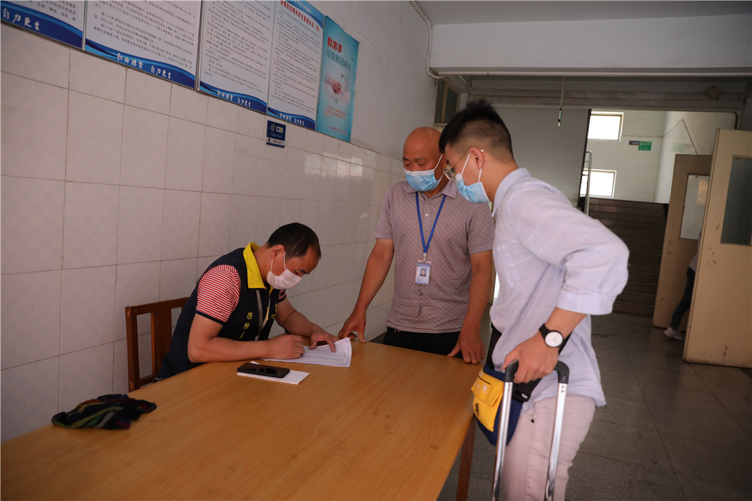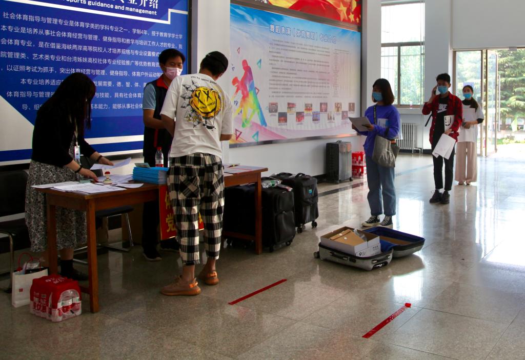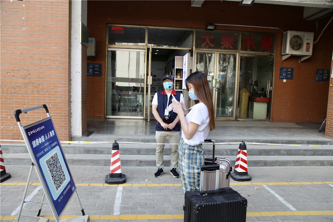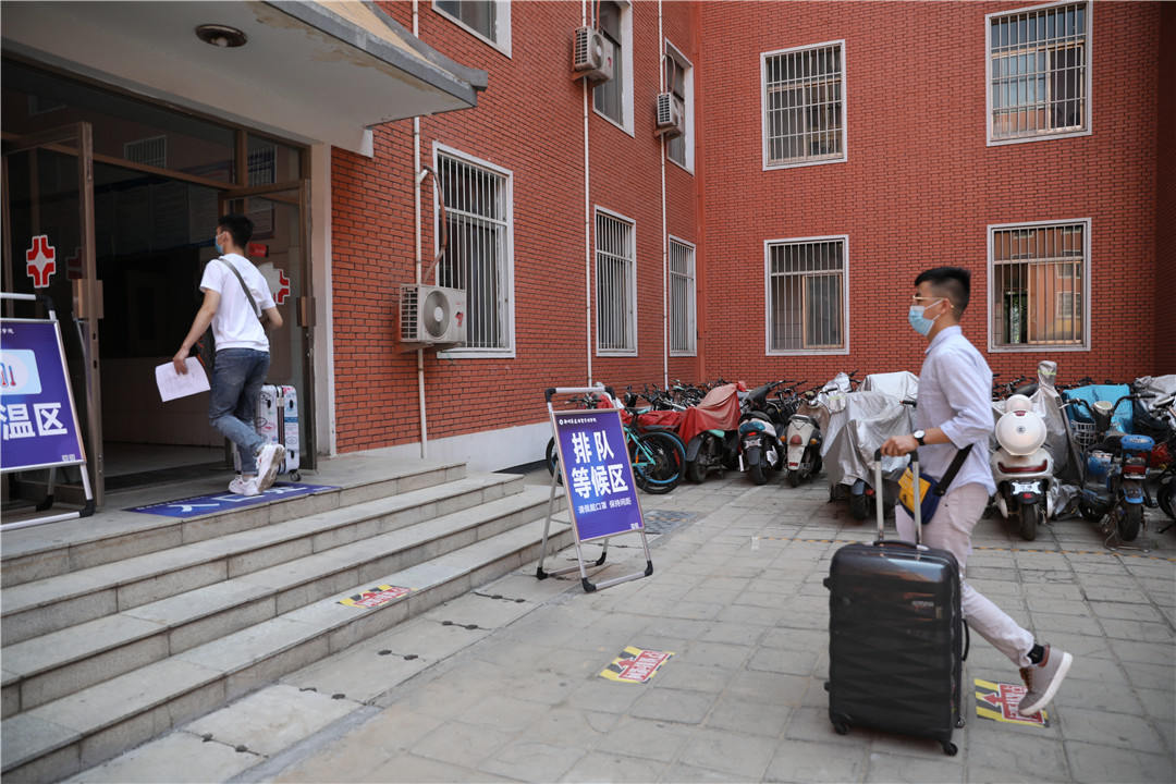 (“回家”毕业生有序排队至宿舍管理人员处办理入住登记)