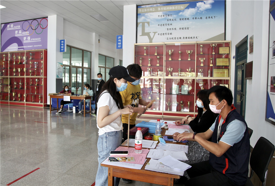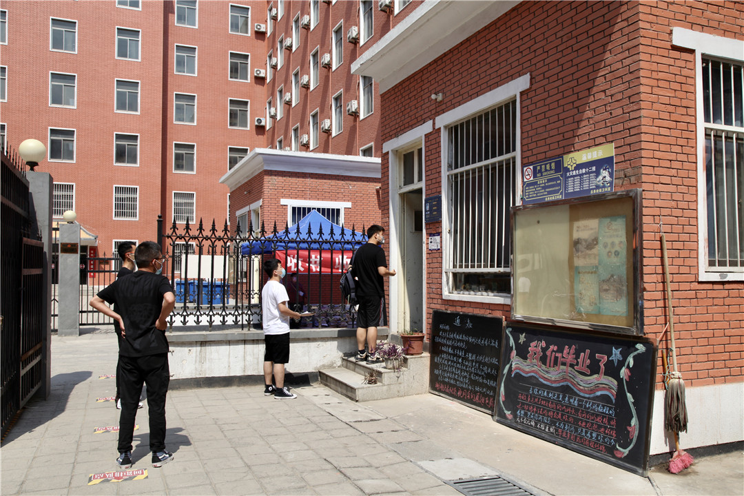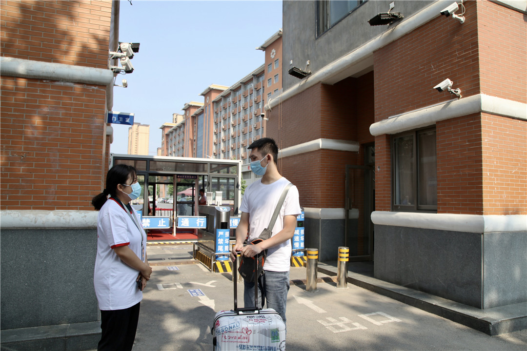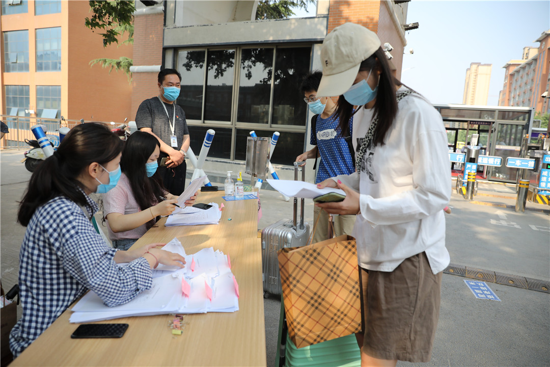 (“回家”毕业生有序排队至宿舍管理人员处办理入住登记)
