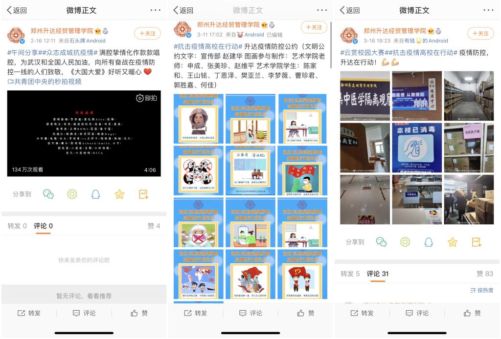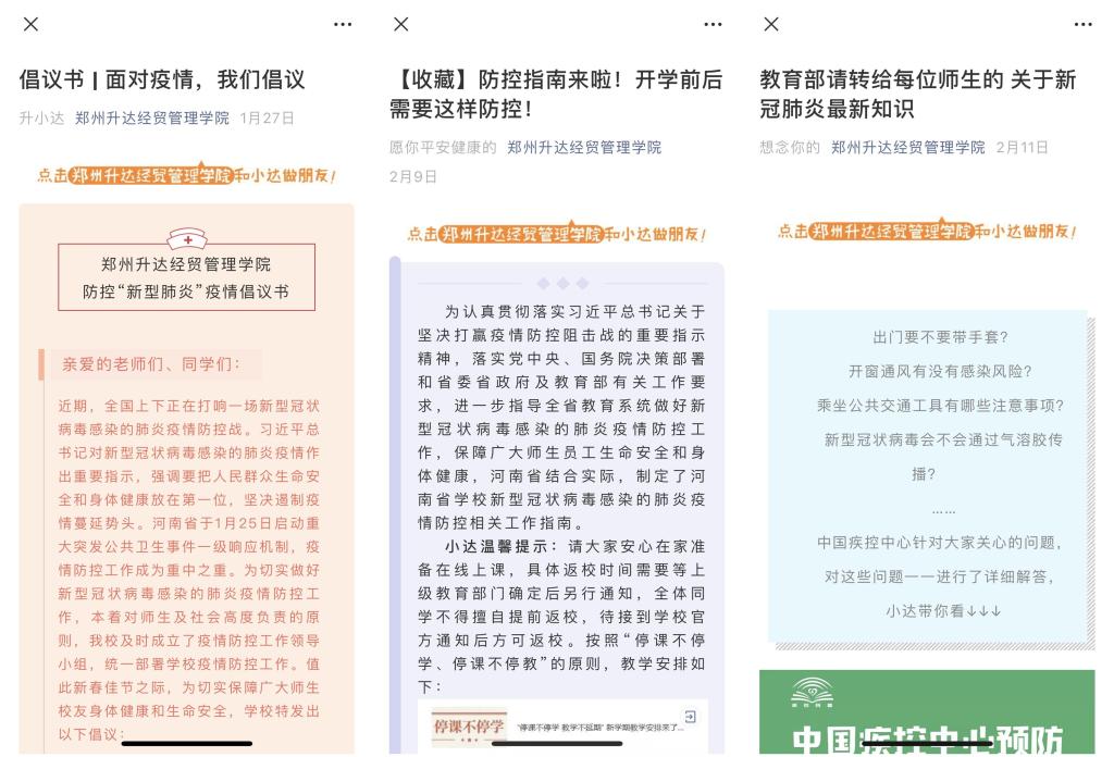 另外,精心对学校学工队伍、教师职员、工友进行了多次分类分层次专题培训。充分利用电子显示屏、宣传栏、条幅、橱窗、喷绘等校园宣传阵地,通过新冠肺炎疫情防控主题网站和微博、微信公众号等网络渠道,全覆盖进行宣传引导。
