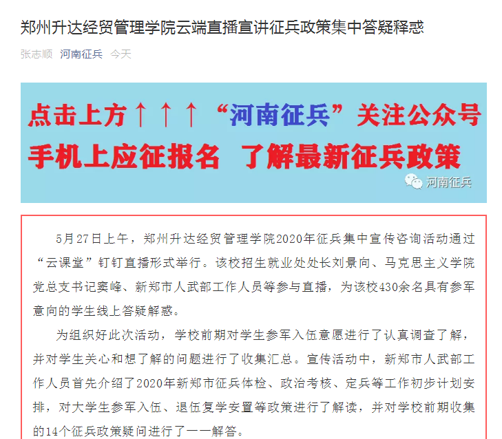 5月31日,河南省征兵官方微信公众号“河南征兵”以《郑州升达经贸管理学院云端直播宣讲征兵政策,集中解惑答疑》为题,头条报道了我校2020年征兵工作“云端咨询直播”的做法,并给予了高度赞扬。