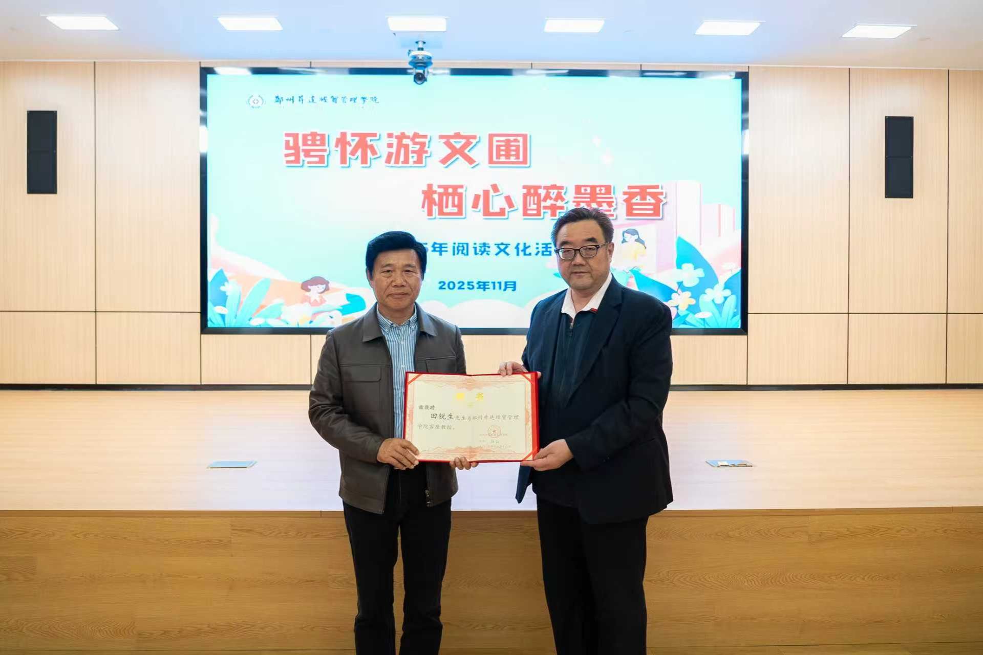 开幕式上,董事长王新奇为河南大学田锐生教授颁发客座教授聘书。