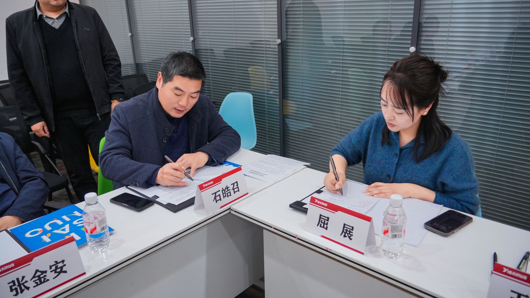 随后,石皓召代表外国语学院与郑州易赛诺数字科技有限公司签署校企合作协议。张金安向易赛诺授予“教学实习实训基地”铭牌,并向企业赠送创办人王广亚博士书法作品《大同篇》。
