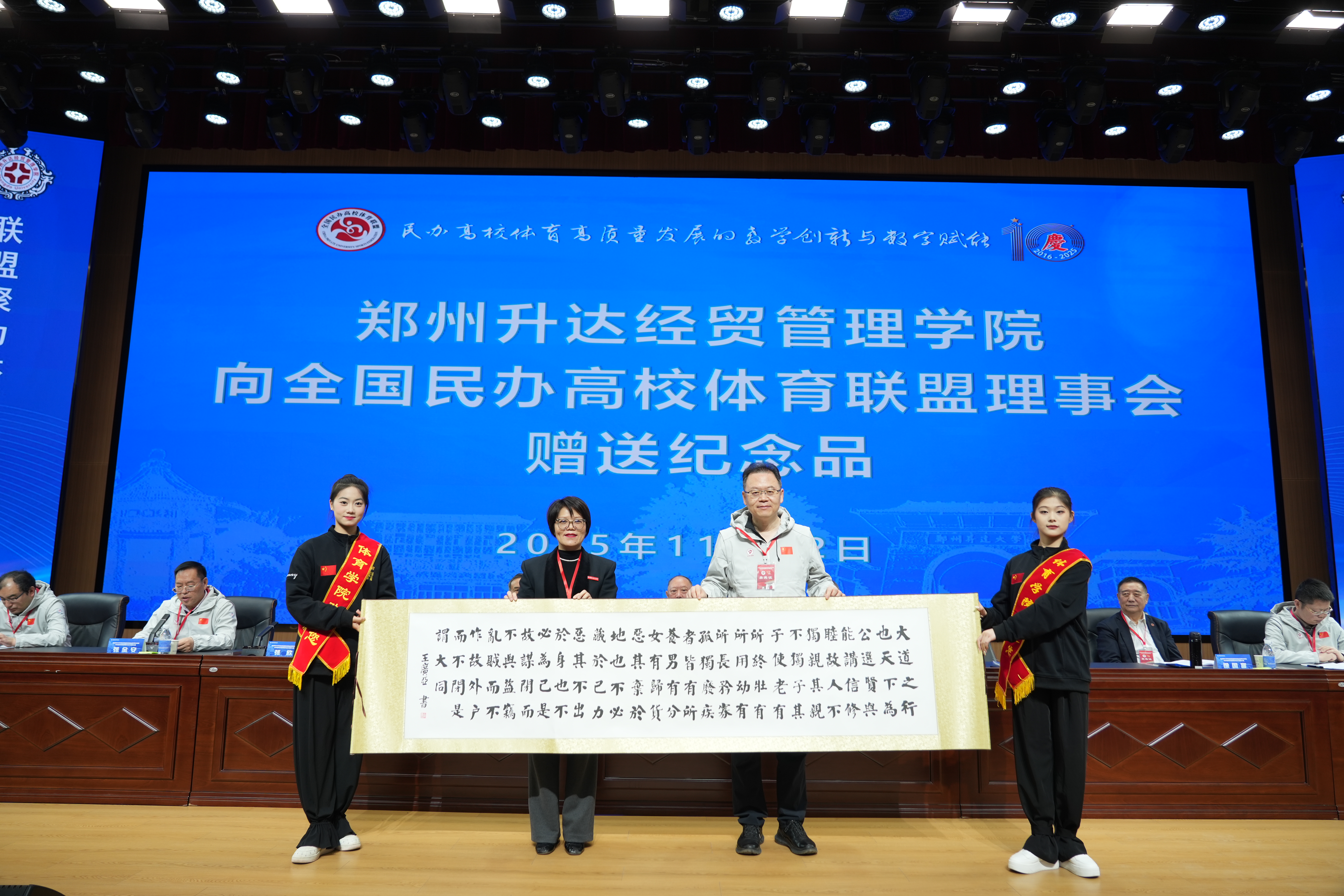 张欣、姜波分别代表升达和全国民办高校体育联盟理事会互赠纪念品。张欣代表学校向莅会的嘉宾池建、姜波、刘纯献、徐国富颁发客座教授聘书。