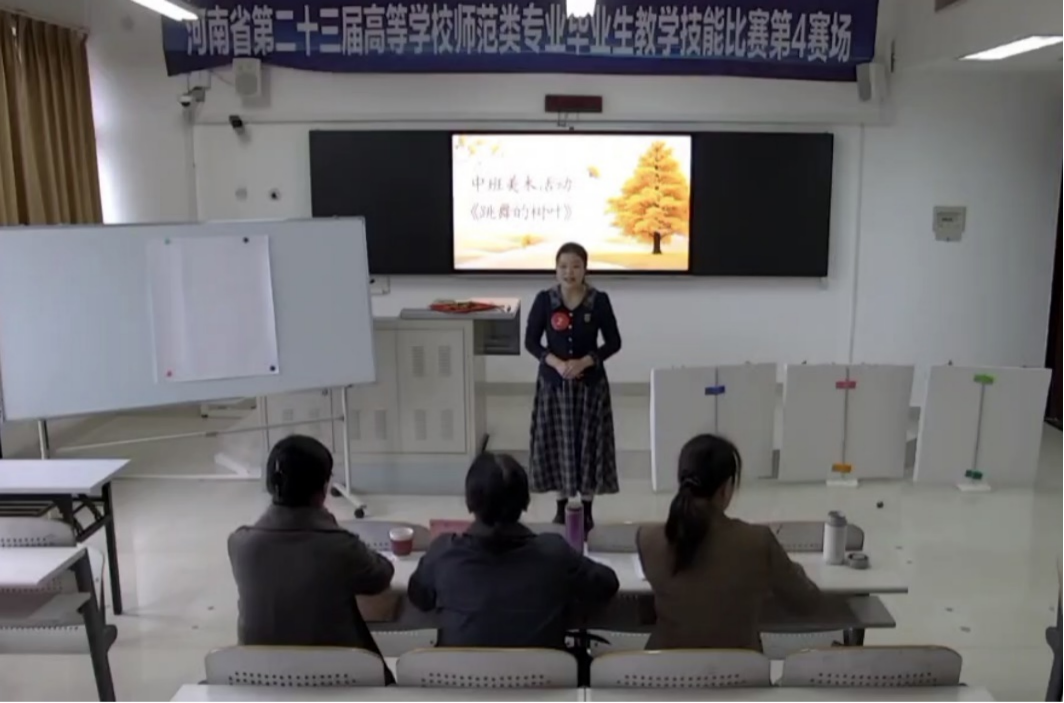 河南省高校师范类专业毕业生教学技能大赛是省内高等教育层面规模最大、影响最广、公信力最高的师范生教学技能赛事。我校参赛学科为学前教育,比赛内容包含微型课、答辩、专业技能展示3个环节。自大赛信息发布后,文法学院领导高度重视,学前教育专业学生竞赛指导小组张孜、马慕青、陈俊梅、梁舒乔四位教师在闫振刚主任的带领下广泛宣传动员,积极开展校级预选赛。比赛中,陈婉茹同学凭借扎实的专业功底和出色的现场表现,展现出我校学前教育师范生突出的实践能力和较高的综合素养,给评委专家们留下了深刻的印象。