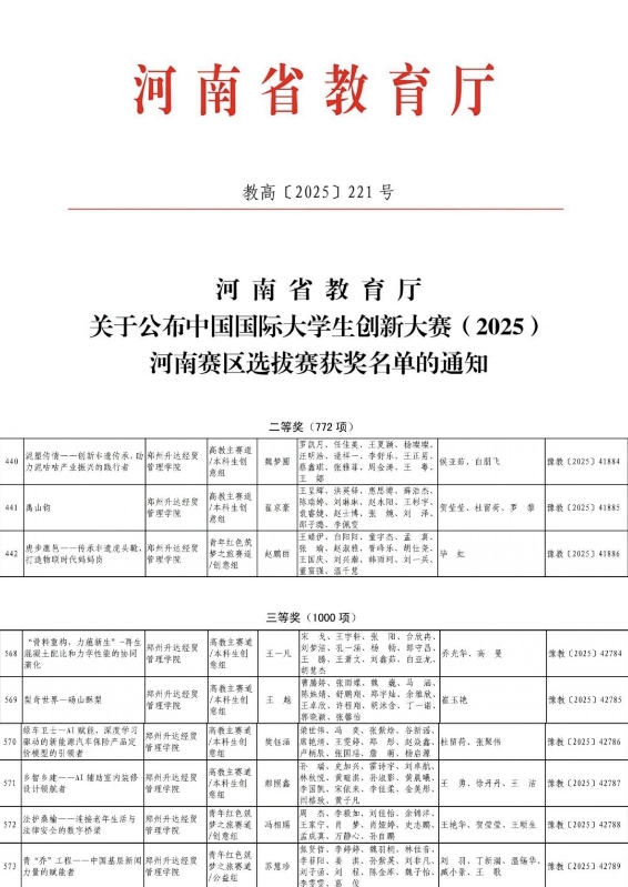 近日,中国国际大学生创新大赛(2025)河南赛区选拔赛圆满落幕。我校参赛团队捷报频传,共有9支队伍成功斩获省级荣誉,其中省级二等奖3项、省级三等奖6项。值得关注的是,本年度获奖数量较2024年实现2倍增长,更实现历史性突破——“红旅赛道”首次跻身获奖行列,一举拿下1项省级二等奖与2项省级三等奖。
