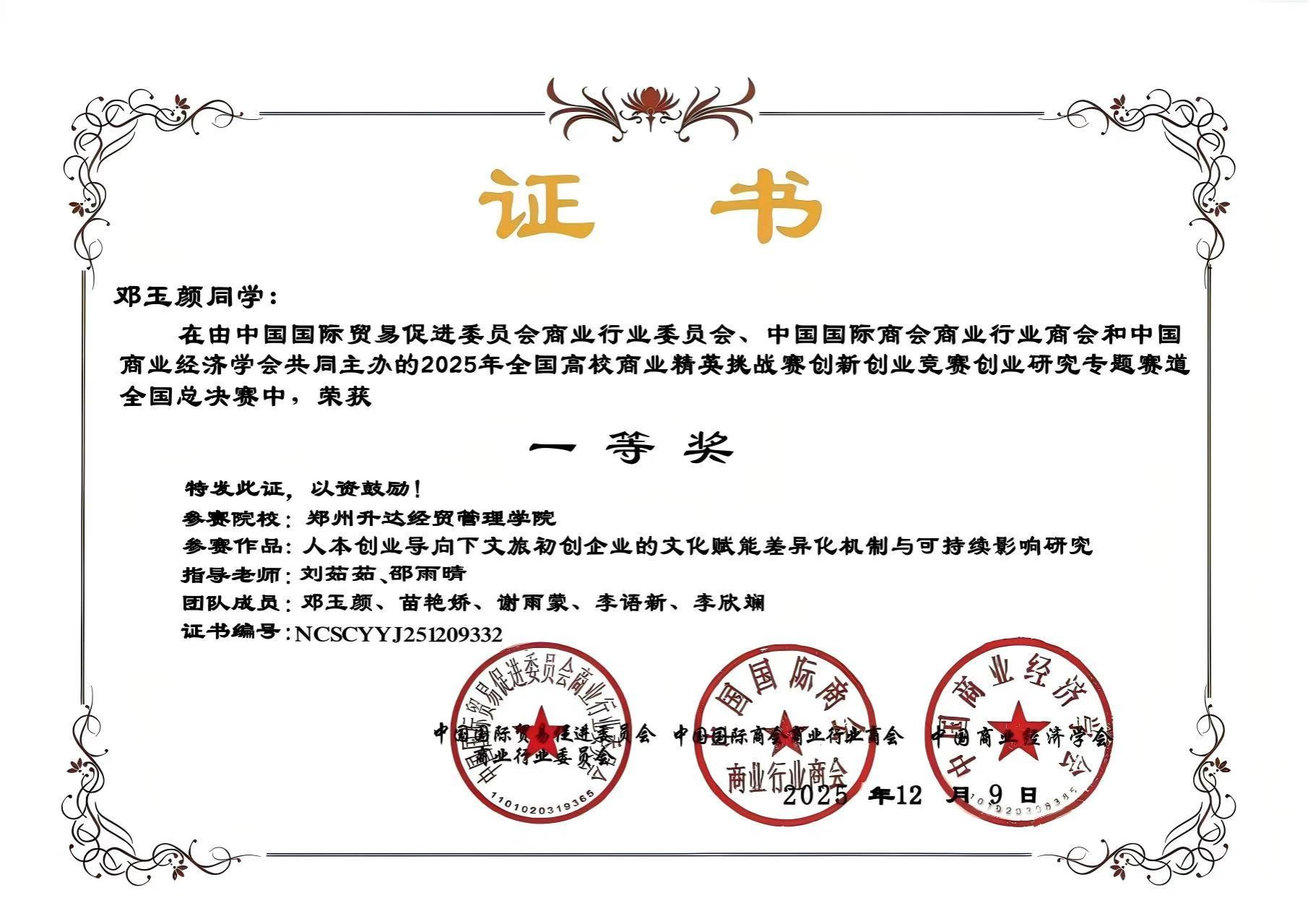 近日,2025年全国高校商业精英挑战赛创新创业竞赛创业研究专题赛道全国总决赛(中国地区选拔赛)圆满落幕。我校旅游管理专业“五星聚力队”凭借深厚的学术积淀、突出的创新思维与扎实的实践能力,从全国众多参赛队伍中脱颖而出,勇夺全国一等奖,为学校赢得崇高荣誉。