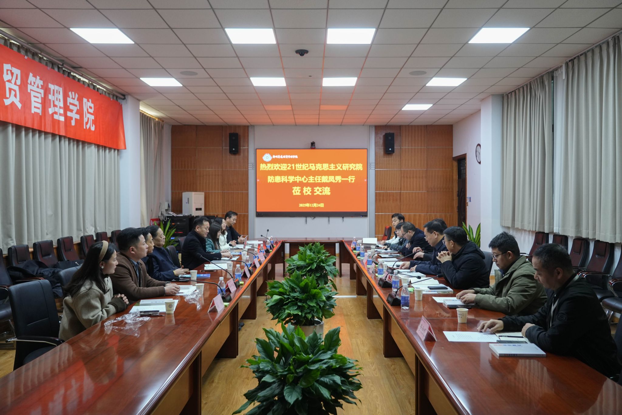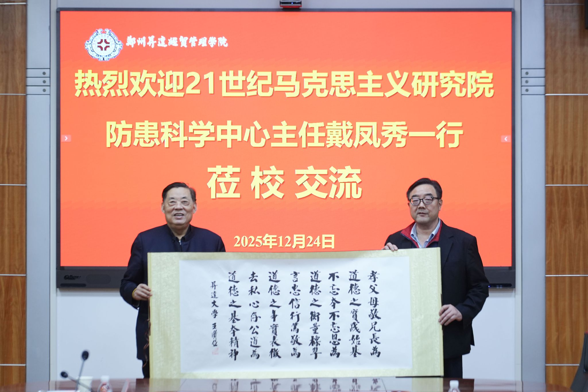 2025年12月24日,21世纪马克思主义研究院防患科学中心主任戴凤秀一行莅临我校参访交流。董事长王新奇博士,副校长张金安,登封校区党工委书记沈定军等校领导及相关职能部门负责人热情接待了来访嘉宾,座谈会在学校第二会议室隆重举行,会议由副校长张金安主持。