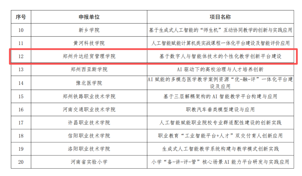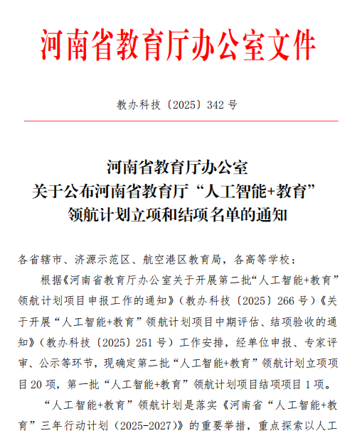 近日,河南省教育厅公布第二批“人工智能+教育”领航计划立项结果。我校组织申报的《基于数字人与智能体技术的个性化教学创新平台建设》项目,今年10月至12月经过网络评审与现场答辩两轮激烈角逐,最终从众多申报院校中脱颖而出,成功获得立项,标志着学校在推动人工智能技术与教育教学深度融合方面迈出关键一步。