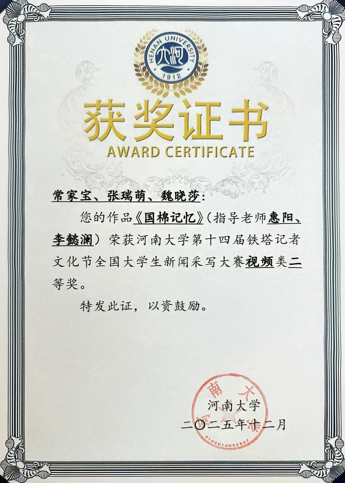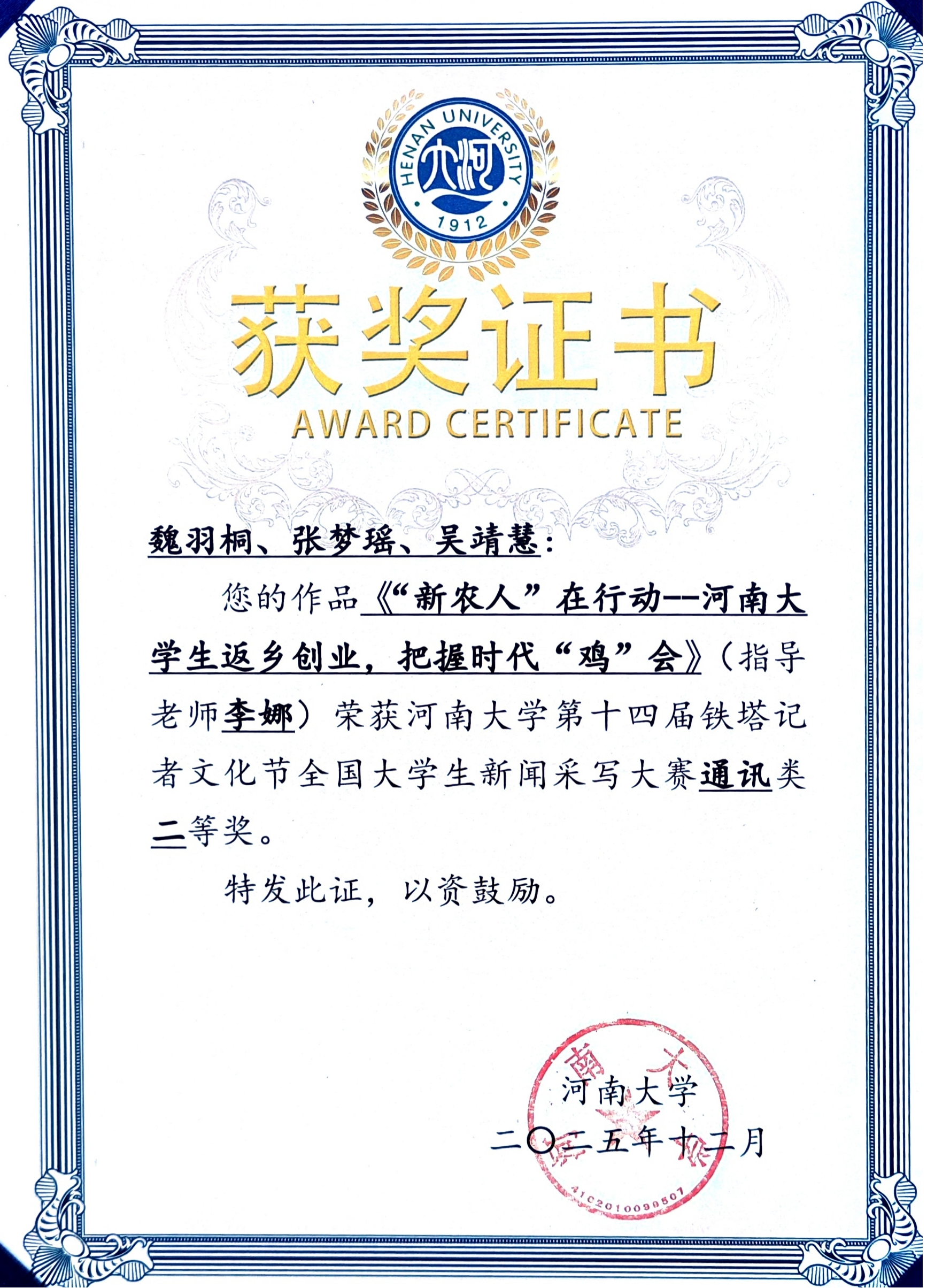 荣获二等奖的作品来自于新闻学和网络与新媒体两个专业的同学。2023级新闻学专业学生邹长倩、梅晓彤、李慧茹的作品《“三重门”羁绊,医专生出路在哪?》荣获非虚构类二等奖;2023级网络与新媒体专业学生魏羽桐、张梦瑶、吴靖慧的《“新农人”在行动——河南大学生返乡创业,把握时代“鸡”会》获通讯类二等奖,卢凯娜的《世界第一高桥通车,更要让“世界第一”直抵人心》获评论类二等奖;2021级网络与新媒体专业学生常家宝、张瑞萌、魏晓莎的《国棉记忆》获视听类二等奖。