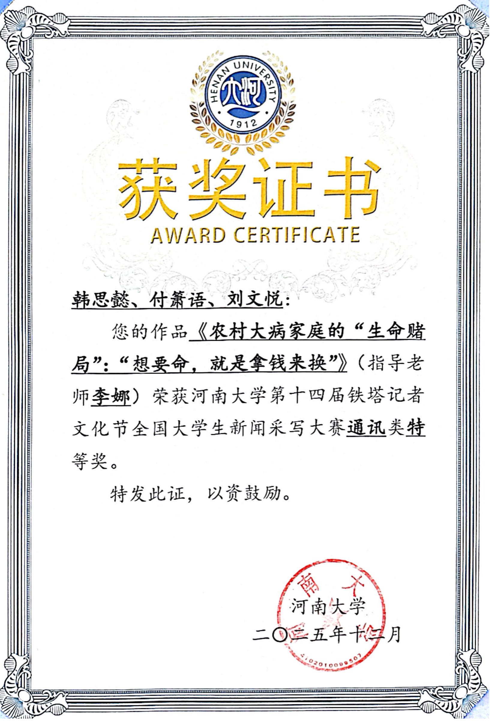 荣获特等奖的两部作品分别是2023级新闻专业学生韩思懿、付箫语、刘文悦的通讯作品《农村大病家庭的“生命赌局”:想要命,就是拿钱来换》和2022级新闻专业学生苏慧珍的消息作品《“比亚迪”郑州号来了!》。通讯作品以深沉的笔触关注社会现实,揭示了重大疾病给农村家庭带来的经济与伦理困境,彰显了新一代新闻人的社会责任与人文关怀;消息作品则敏锐捕捉城市发展动态,以精准简练的笔法快速传递了重要信息,体现了新闻的时效性与专业性。