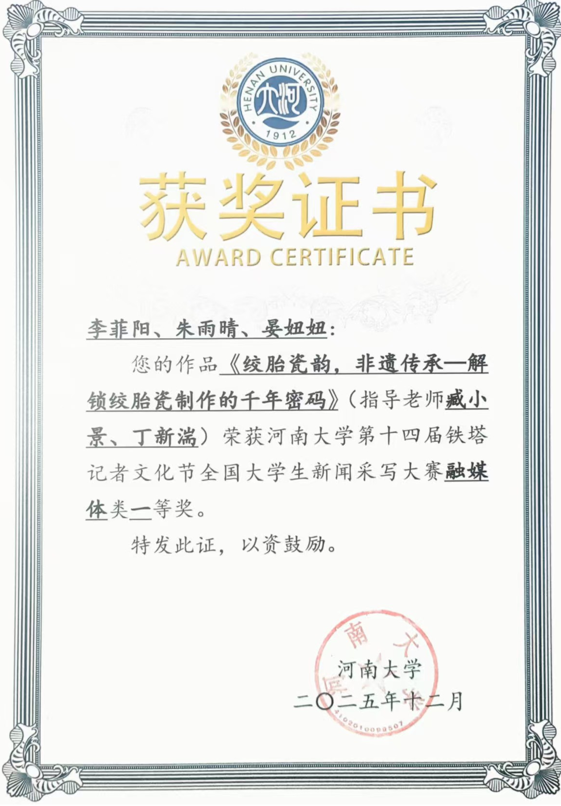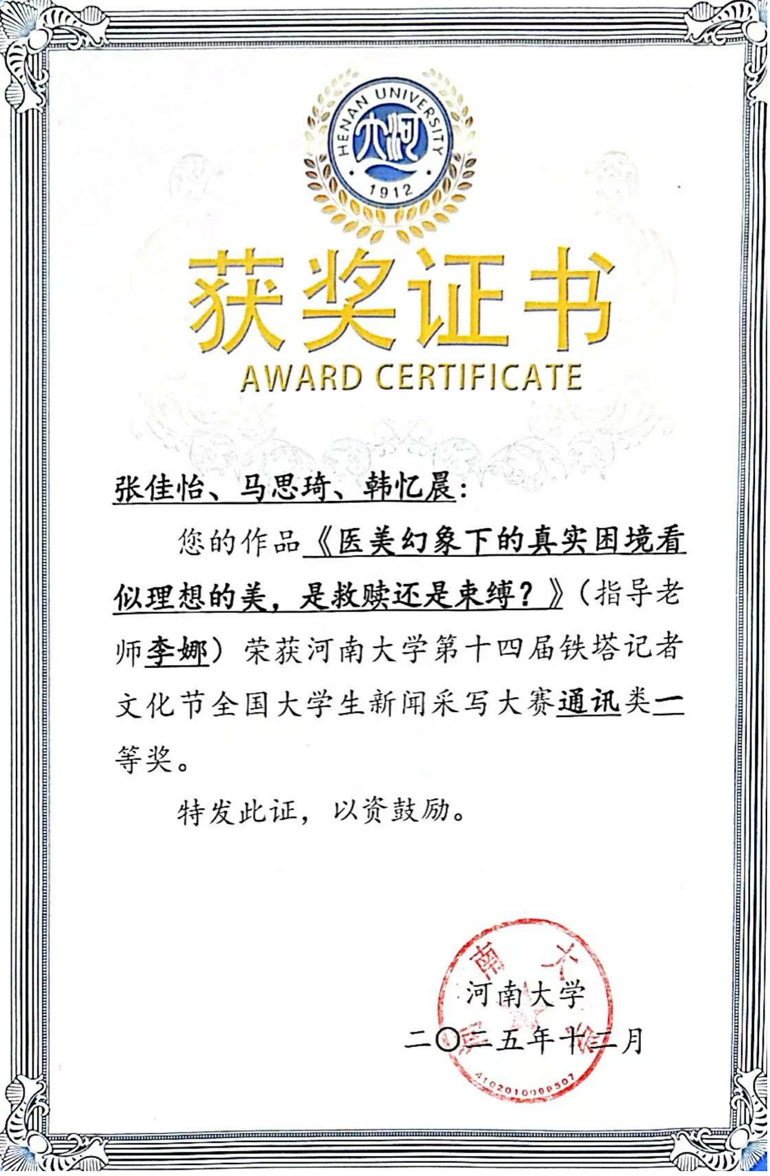 荣获一等奖的作品来自于新闻学专业的同学。2022级新闻学专业学生肖依娴的作品《别让孩子在性教育上“自学成才”》荣获评论类一等奖,李菲阳、朱雨晴、晏妞妞的作品《绞胎瓷韵,非遗传承——解锁绞胎瓷制作的千年密码》融媒体类一等奖;2023级新闻学专业学生张佳怡、马思琦、韩亿晨的作品《医美幻象下的真实困境看似理想的美,是救赎还是束缚?》和张秋粉、刘子豪、赵俊青的作品《打破就业困局:医专生在迷雾中寻求希望》荣获通讯类一等奖。