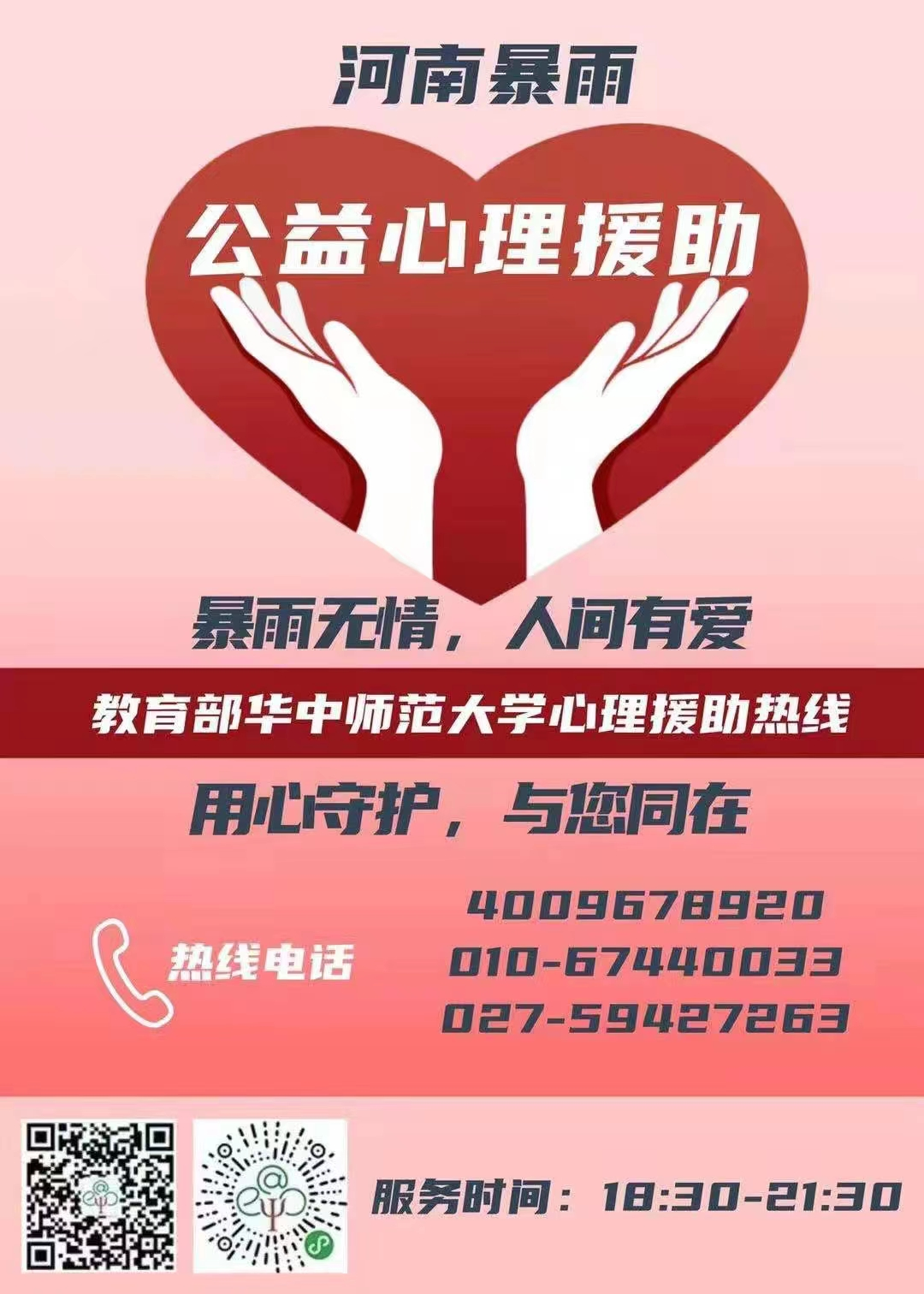 教育部华中师范大学心理援助热线4009678920