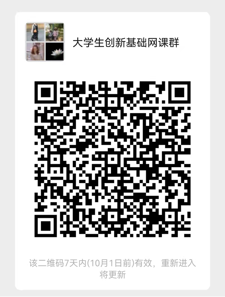 2.请19级本科和21级专升本所有班级的学艺请加入“大学生创新基础网课群”微信群,群二维码在下方。学艺进群后备注自己的专业、班级和姓名(如:19级会计学本科一班学艺+名字),可及时反馈学习过程中的问题。本群不回答其他与本门课程无关的疑问(请同学们注意在群二维码有效期内入群)。