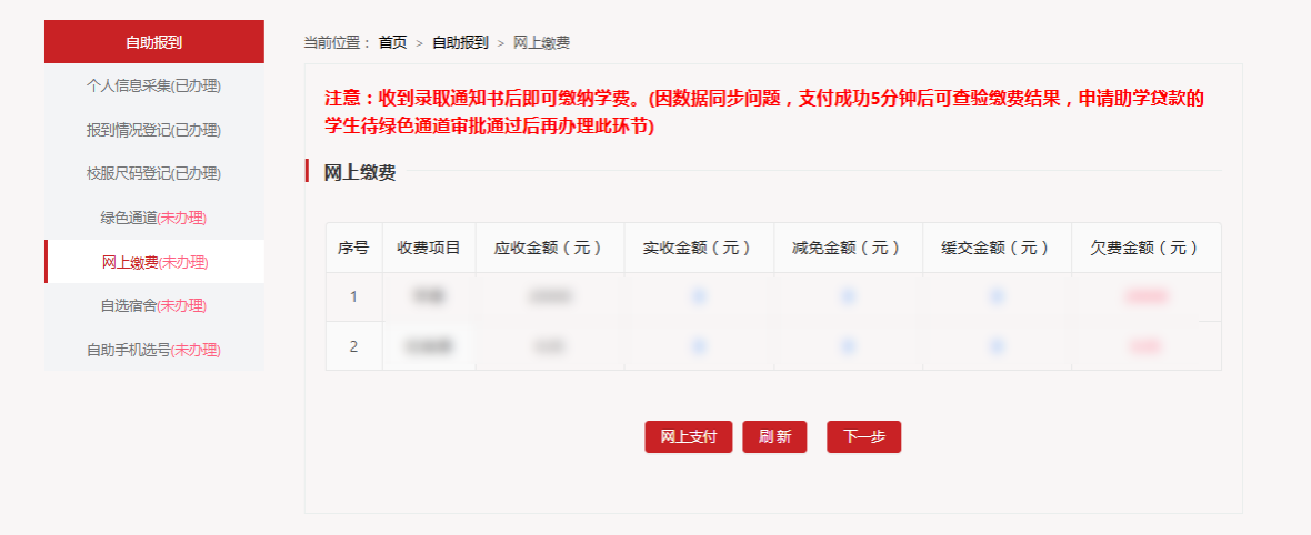 5、【网上缴费】:收到录取通知书后即可缴纳学费。(因数据同步问题,在线支付成功5分钟后可查验缴费结果,申请助学贷款的学生待绿色通道审批通过后再办理网上缴费环节)。