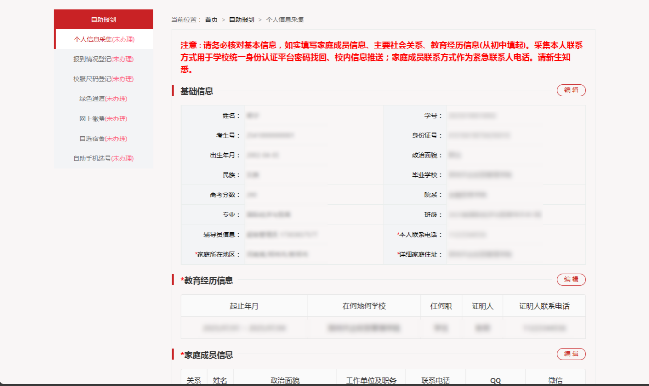 1、【个人信息采集】:包括联系电话、家庭住址、家庭成员信息、主要社会关系、教育经历信息(初中填起)。