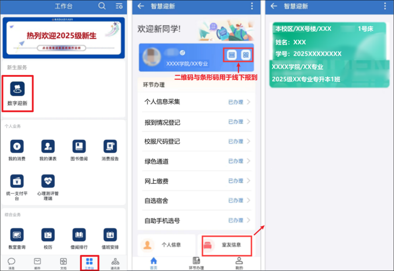 移动端请进入企业微信客户端,依次打开“工作台—新生服务--数字迎新”进入迎新系统,即可进行自助报到各环节的办理。