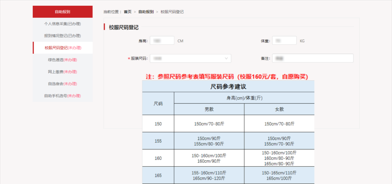 3、【校服尺码登记】:参照尺码参考表填写服装尺码(校服160元/套,自愿购买)。
