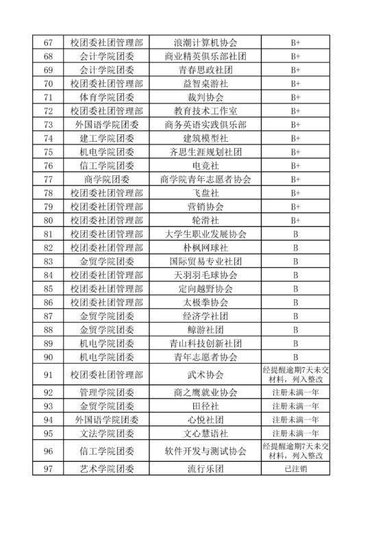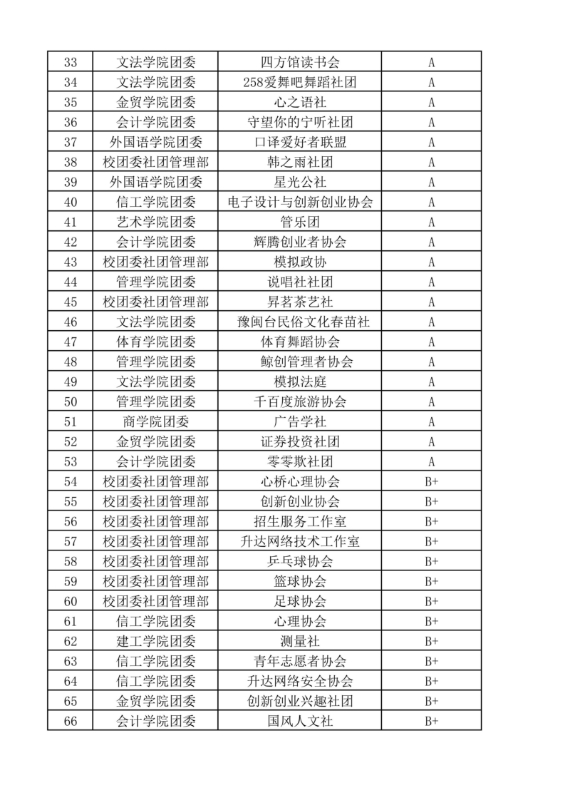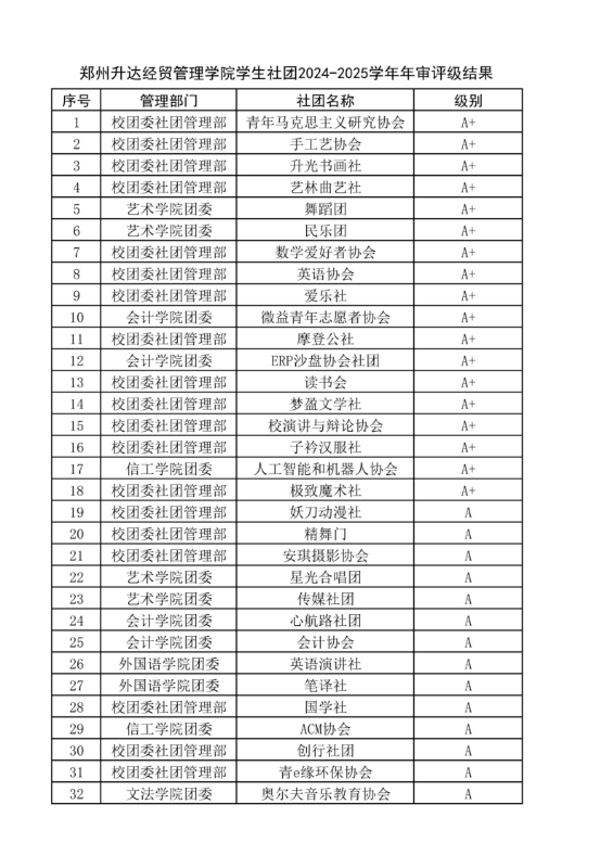 为切实加强学生社团建设管理,促进学生社团健康有序发展,依据《高校学生社团建设管理办法》(教党[2020]13号)、《郑州升达经贸管理学院学生社团管理办法》及《郑州升达经贸管理学院学生社团评级评分标准》,经学生社团自评、年审评级工作小组评审等环节,现将我校学生社团2024-2025学年年审评级结果予以公布。