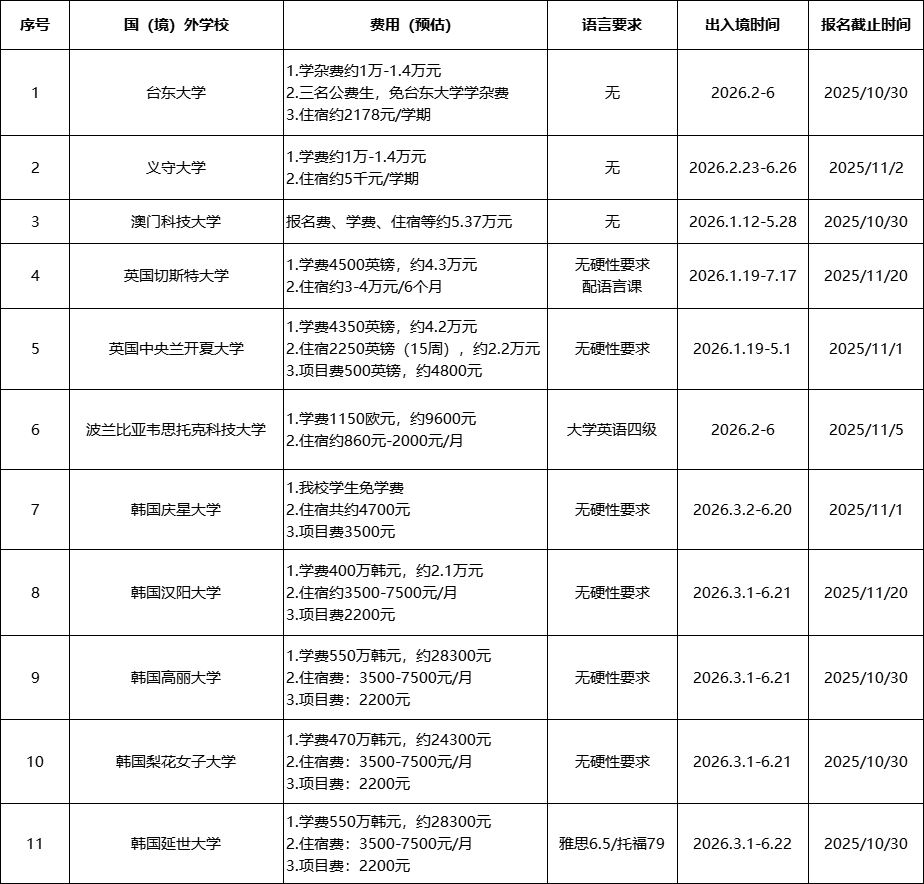 为促进我校与国(境)外高校学生间的学术交流与学习,提高学生的综合素质,激发学生创新学习的动力,我校每学期选派学生至国(境)外合作院校进行交流学习。现将2026年春第一批赴国(境)外交换生项目报名具体情况通知如下,第二批另行通知。