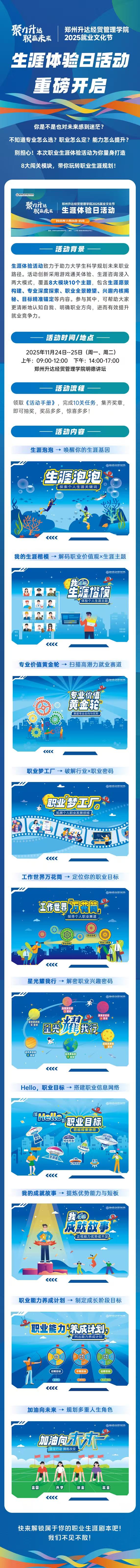 为进一步帮助同学们科学规划职业生涯,提升就业竞争力,郑州升达经贸管理学院将于2025年11月24日至25日(周一、周二)在明德讲坛举办“生涯体验日”活动。此次活动是2025就业文化节的重要组成部分,主题为“聚力升达·职赢未来”,旨在通过游戏化的职业探索与专业咨询,让每位同学都能找到属于自己的职业路径。