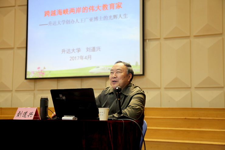 报告会上,刘道兴院长由孔子一生追求的教育理想“有教无类、因材施教”来推及我们的教育实践家——王广亚博士,指出拥有王广亚是我们升达的骄傲,升达大学拥有创办人王广亚,就是拥有一段历史,一部大书,一个传奇,并展示创办人各个时期的图片让我们感到创办人仿佛还在身边。接着,刘道兴院长将创办人出生艰苦的岁月、曲折的求学经历,及王广亚博士在台湾如何缔造了民办教育的王国,王广亚博士回到家乡,回馈桑梓,创办我们升达大学,都进行了详细的阐释。在总结语中,刘道兴院长说,创办人的办学精神境界、教育动力之源、丰富的育人实践,更深层次的原因和力量,在于他对中华传统文化特别是孔子教育思想的深邃认知,在于他对教育发展与振兴中华密切关系的切身体悟,在于创办人对人生终极意义的探索,是大爱的具体体现。刘道兴院长的这场报告语言幽默诙谐,感情丰富诚恳,现场气氛厚重中又有激越,掌声持续,师生获益颇丰。