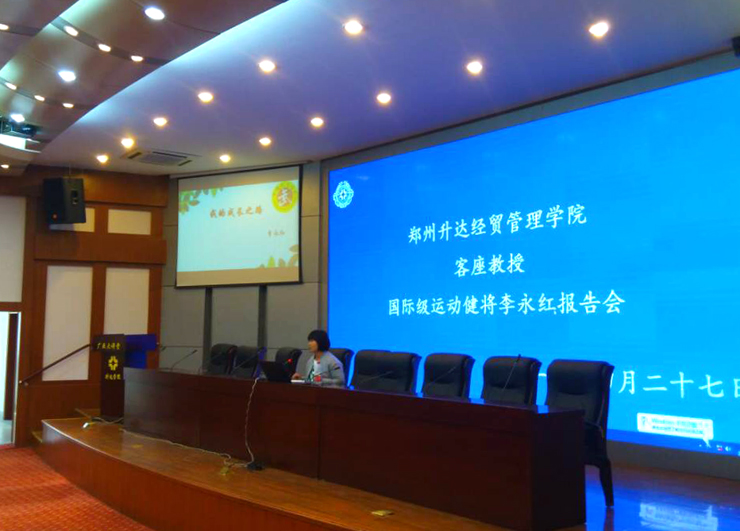 在随后的报告会上,李永红女士首先讲述了“为什么习武”,她说除了天赋、兴趣之外,更多地是想要通过习武来磨练自己的毅力、锤炼自己的个性,不断突破自我,成长为有用之材。其次,她详细介绍了自己运动生涯的训练过程和竞技历程,包括在嵩山少林寺塔沟武校接受学习和训练的经历,以及参加每次大赛的过程。习武之路注定无比艰辛,但是李永红没有放弃,始终聆听老师的教导,始终坚持刻苦的训练,在训练中思考,在思考中提高,世界冠军的称呼是对她艰苦训练、不懈努力、勇于拼搏的最好赞誉。整场报告会内容翔实,形式活泼,参加报告会的学生听后都倍受鼓舞。