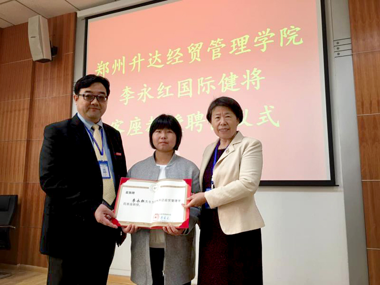 4月27日上午,正值我院第二十届田径运动会开幕式,李永红女士作为嘉宾出席。开幕式结束后,学院院长郭爱先和执行董事王新奇在第二会议室亲切会见了李永红女士,并向她颁发了学院客座教授证书。