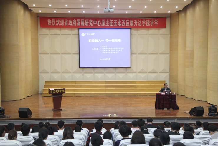 4月27日下午,我院科研处邀请河南省人民政府发展研究中心原主任王永苏研究员在艺术系音乐厅作关于《积极融入一带一路战略》的形势报告。出席报告会的学院领导有:院长郭爱先、院党委书记张德伟,副院长张金安、副院长吴益民,相关部门主管,部分教职员代表和学生代表近500人。报告会由吴益民副院长主持。