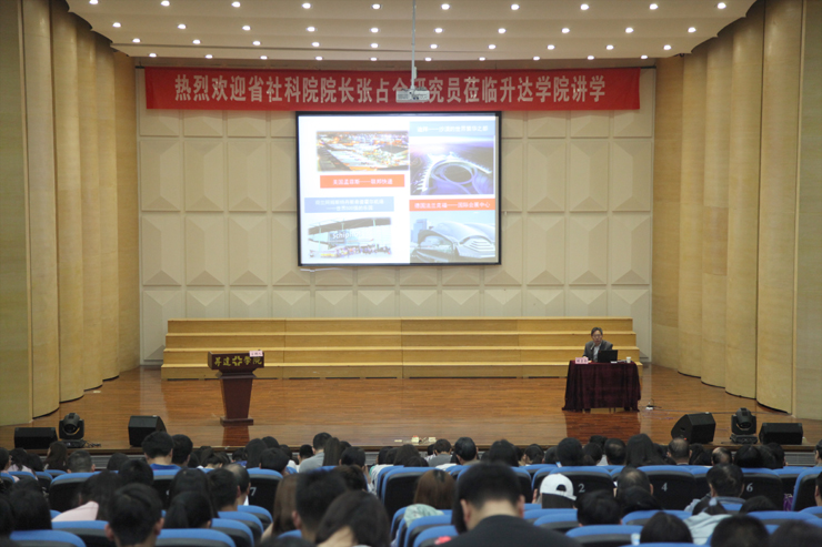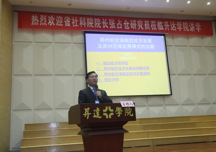 4月28日上午,学院邀请河南省社会科学院院长张占仓研究员在艺术系音乐厅作《郑州航空港临空经济发展及其对区域发展模式的创新》的专题报告。出席报告会的学院领导有:院长郭爱先、常务副院长崔慕岳、副院长张洁、副院长吴益民,部门主管及教职员和学生代表近500人。报告会由张金安副院长主持。