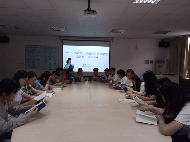 6月8日下午金贸系党建办公室在商管楼104召开大学生宗教知识宣传会议,2016级金贸系各班班长和团支书代表、党建办公室全体成员参加了此次会议。