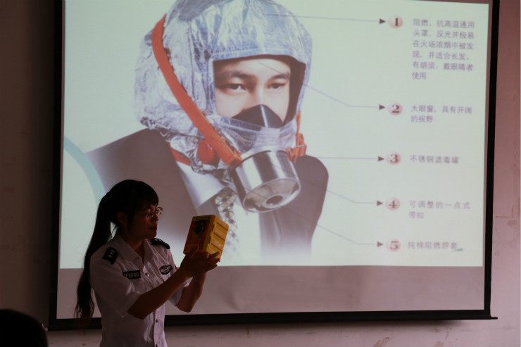 教官再三强调,火场逃生最重要的是防烟。一张张血淋淋惨不忍睹的画面警示我们防烟的必要性。张教官分析了浓烟内外围高温、含有毒气体、传播速度快的特点。介绍了防烟常用的两个办法:湿毛巾和防烟面具。重点介绍了防烟面具的工作原理和使用方法。
