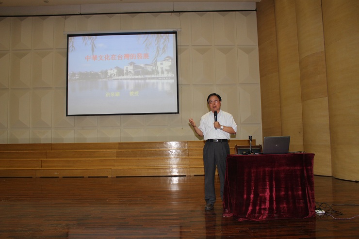 “万里长城万里长,长城外面是故乡。高粱肥,大豆香,遍地黄金少灾殃。”洪泉湖教授现场饱含深情地为大家即兴演唱了一首《长城谣》,赢得阵阵掌声。洪教授从重要文物、学术思想、文学、戏剧、舞蹈、音乐、美术、工艺、建筑、宗教、美食等方面,详细讲解了中华文化在台湾的传承以及台湾对中华文化的创新。他说,台湾文化就是中华文化,中华文化传到台湾虽然产生了变化,但是对中华文化的传承和创新,台湾人民对得起祖先。讲授过程中,洪泉湖教授结合自身的经历列举了许多鲜活的事例,并以其幽默的语言及丰富的表情和肢体动作给现场师生留下了深刻印象。