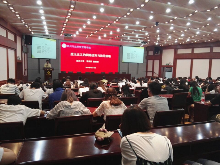 6月13日下午14时30分,受商学系邀请,郑州大学新闻与传播学院副教授、硕士生研究生导师、美国迈阿密大学访问学者、河南省骨干教师、河南省“教学标兵”、中国大学生广告艺术节学院奖“杰出指导教师”常燕民副教授在国际会议厅为广大学子作了一场题为“虚无主义的网络流布与治理路径”的报告会,商学系于平主任、田振中副主任出席,商学系三百余名学生参会。