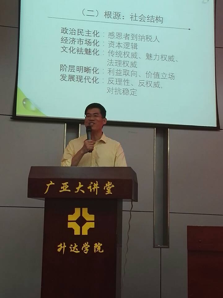 首先,常燕民副教授从“高考改变命运吗?”入题,指出历史虚无主义在“2015 年值得关注的十大思潮”中居第二位。让同学们深思,“当今社会人的价值观缺失,观念没有善恶,行为没有底线,现在社会上出现的种种问题病根都在这里。”然后,他分别从虚无主义的网络流布的呈现形态、流传规律、社会影响、产生原因进行详细的讲解。