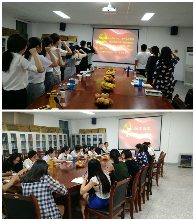 接着,王新平书记向2017届毕业生党员发起倡议:一、不忘誓词,践行党员职责。时刻牢记自己是一名光荣的共产党员。二、加强学习,要有学习意识。学习专业知识,学习业务知识,向同事学习,向实践学习。三、模范带头,牢记党的宗旨。全心全意为人民服务,充分发挥党员的先锋模范作用。四、感恩母校,不忘母校培养。希望大家在未来的工作、学习、生活中,将母校的优良传统发扬光大。五、志存高远,开拓美好未来。希望毕业生党员为广大毕业生做好榜样,立足本职,锐意进取,让母校的明天因你们而自豪!