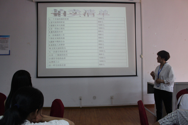 讲座开始,钟书记让同学们分成两组做游戏。“逢七必过”的小游戏拉近了同学们之间的距离,活跃了气氛,让大家明白了在团队合作中专心致志的重要性。接着,钟书记给每个同学分了一万块钱,让大家以拍卖会的形式参加“价值观大考验”。拍卖品有“幸福美满的家庭、永远都花不完的钱、健康不会生病的身体、最完美的恋爱、友情、美貌、等。”同学们争先恐后的买了自己想要得到的东西,也有同学什么都没买。钟书记让他们分别说明“自己为什么要买自己买的东西,后悔吗?”“为什么什么都不买?”等问题。在大家说明自己的追求和梦想以后,钟书记告诉大家,每个人都有自己的追求,每个人都会为了自己追求的东西去努力。一个人缺少什么,内心就渴望得到什么。