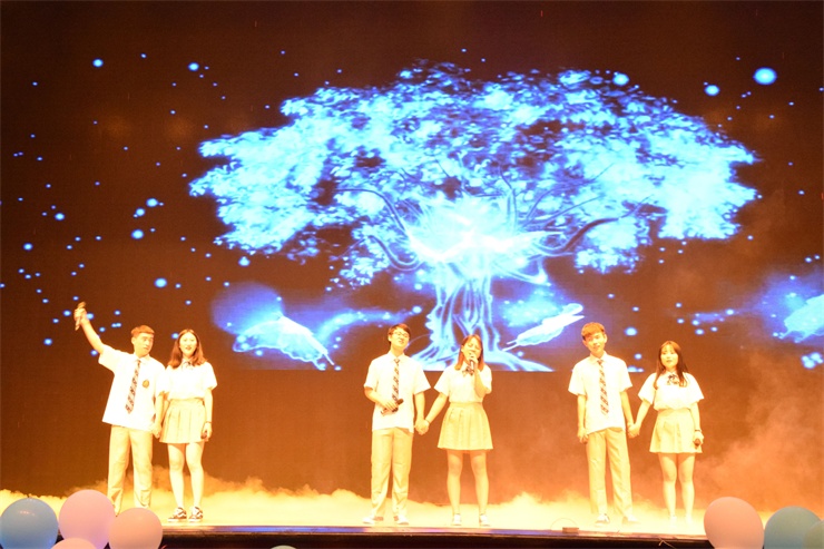 精彩的节目在霓虹闪烁中逐一登场,校园十佳歌手冠军钱世豪的独唱《你就不要想起我》,外语系系十佳歌手冠军贾喻晴携伙伴男女对唱《需要人陪》,或婉转低回,或高亢激昂;歌曲联唱《信仰》+《咏春》+《小幸运》更是中、英、日三语联唱,引人入胜,引来阵阵掌声;由星光公社民族舞队表演的当代舞《致青春》舞姿美奂美仑,婀娜妩媚,观众席鸦雀无声沉浸这衣袂飘飘的舞蹈当中。小品《选妃记》和相声《福寿全》了,演员们夸张又到位的表演惹得观众开怀大笑。英语话剧《仲夏夜之梦》的表演更是充分展示了外语学子的专业功底和表演技能。晚会的高潮是神秘嘉宾的即兴表演,外语系14届毕业生、第17届学生会主席、星光公社创始人王大千学长演唱了一首慷慨激昂的歌曲《等待》,翻译教研室主任闫冰老师深情款款的演唱了英文歌《Can you feel the love tonight》,副主任崔瑾英副教授带来了日文版的《我只在乎你》,整个思源会馆都沸腾了。美好的时光总是短暂的,当我们还沉浸在这场视觉和听觉相结合的盛宴当中时,外语嘉年华在张佳雯演唱的主题曲《Dream it possible》里完美落幕。