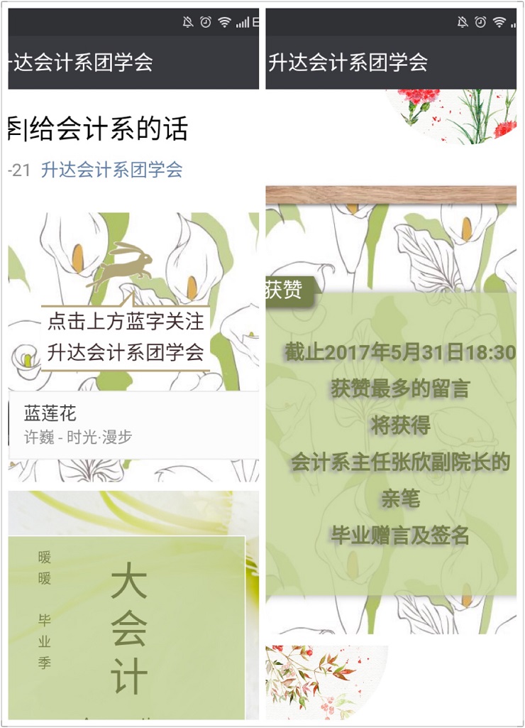 在大会计的日子里,忘不了那些和大会计并肩参与的运动会、忘不了那些和大会计一起参见的各种比赛、忘不了的大会计为我们创造的点点滴滴。现在毕业季马上就要到来了,因此希望他们和大会计来一场庄重的告别。在这次活动中每位同学都可以在留言区写下自己与会计系的故事、想对学弟学妹说的话或是对大会计的祝福与建议。活动截止时,获得最多“赞”的留言将会得到我院副院长兼会计系主任张欣副教授的亲笔毕业赠言以及签名。
