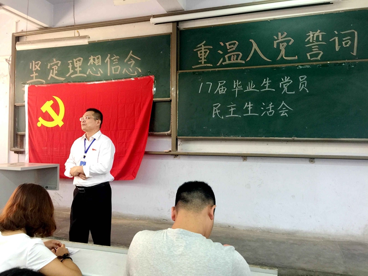 伴着雄壮的《国际歌》,尹红艳老师宣布2017届毕业生党员民主生活会正式开始。会上,由学生第四党支部书记董飞同志带领全体参会同志重温入党誓词。随后,毕业生代表蒋明晓同志发言。她感谢党组织的培养教育、校训的鞭策及老师们的教导,用简短的话语概述了自己将会以饱满的精神面貌投身今后的工作中,时刻以共产党员的标准严格要求自己,坚定理想信念,牢记责任使命,以更加优异的成绩,践行对党的庄严承诺。