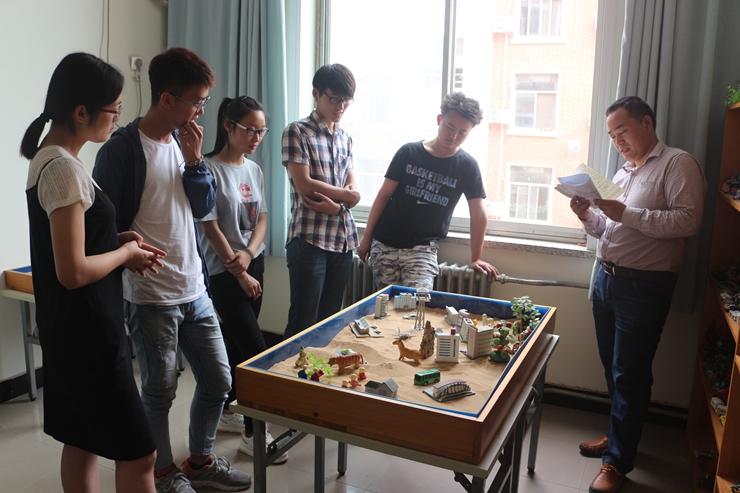 首先,赵建华老师详细讲解了沙盘游戏的定义、历史。随后,在赵老师的带领下轮流抽签进行。同学们兴致盎然在箱庭治疗室的沙箱中对未来展开细心的想象,制作沙盘,老师仔细记录同学们的动作和选取的玩具。制作完成后,各组成员交互相沟通交流对各自的作品提出别出心裁的主题命名。在赵老师做活动记录整理过程中,同学们便迫不及待的谈起自己在实践活动中的切身体会:轻松愉悦的氛围,自由自在的憧憬,既体现团体的责任感又改善了人际关系。