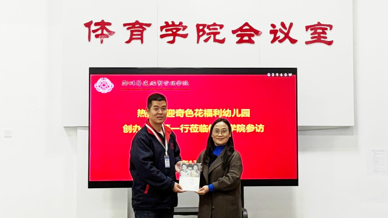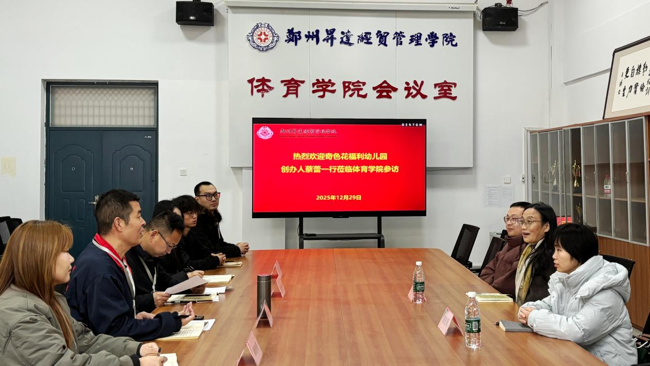 12月30日,郑州市管城回族区奇色花福利幼儿园创办人蔡蕾、行政中心主任袁俊青一行参访我校体育学院,围绕融合体育专业学生实践、特殊需要儿童体能发展、校企协同育人等核心议题开展深度交流座谈。我校侨联秘书长王博,体育学院党委书记韩炎涛、党委副书记高建涛、就业专员康晓晨、团委副书记李苏婷及学生代表参加交流活动。